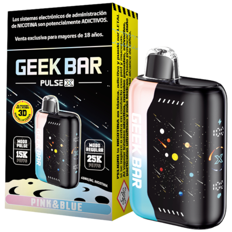 Geek Bar Pulse X 25 000 Puffs es un vape desechable de última generación con batería recargable de 800 mAh, puerto USB-C, y 18 mL de e-líquido con nicotina al 5%, equipado con bobina dual mesh para ofrecer un sabor intenso y vapor abundante. Dispone de dos modos de uso: el Regular, que alcanza hasta 25 000 puffs, y el Pulse, que ofrece mayor potencia y sabor con unas 15 000 inhalaciones.