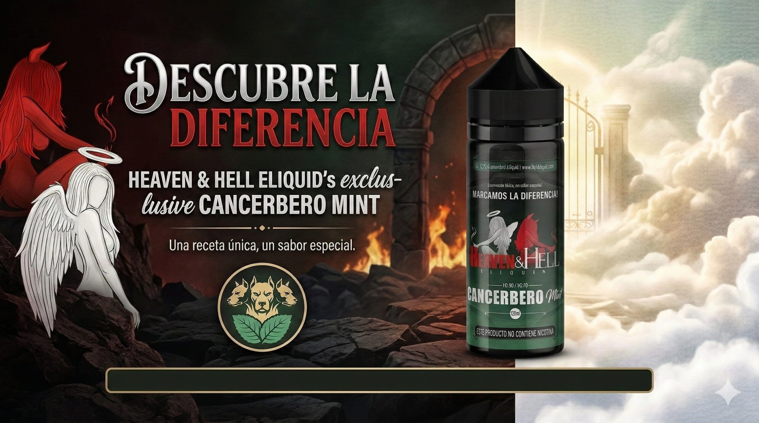 Heaven & Hell Cancerbero Mint 120ml. Disfruta de una menta potente y profunda que domina cada calada. Diseñado para quienes buscan un golpe de frescura intenso, duradero y sin complicaciones. Ideal para vapear todo el día sin cansar el paladar.