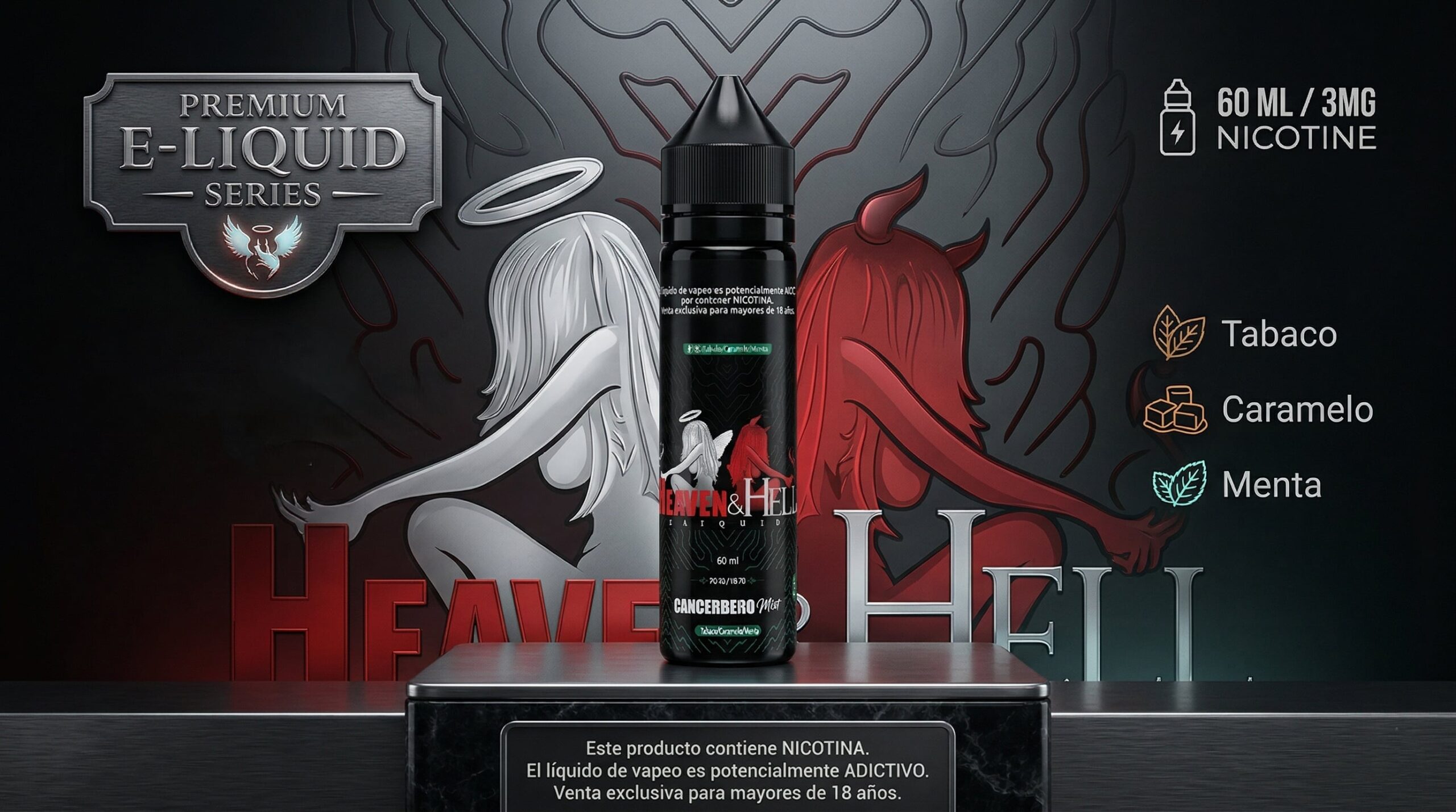 Heaven & Hell Cancerbero Mint 60ml, experiencia de vapeo tan audaz como refrescante. Imagina el vigor inquebrantable de la menta más intensa, una ráfaga glacial que purifica tus sentidos con cada inhalación, mezclado con la robustez del tabaco y la dulzura de la vainilla con el caramelo ¿Te lo vas a perder?