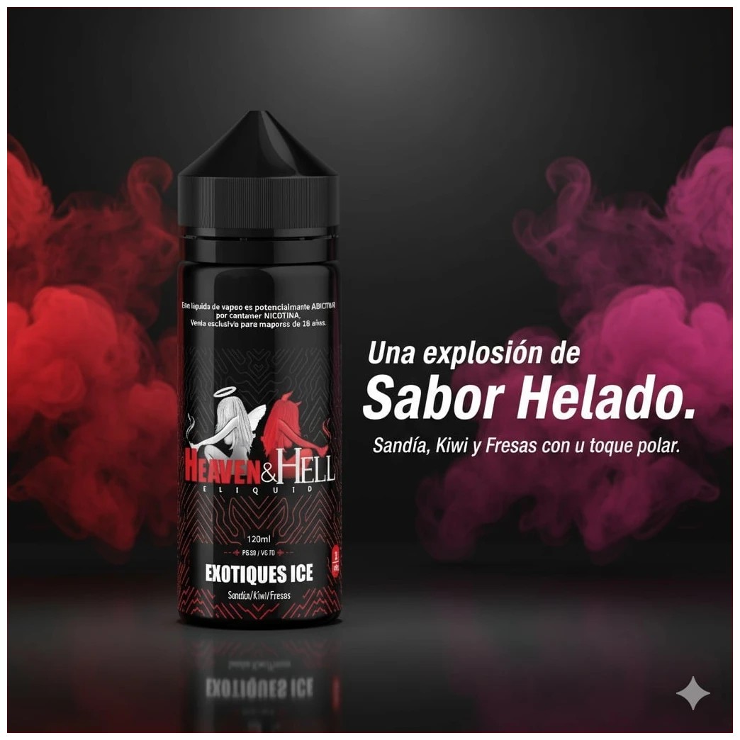 Heaven & Hell Exotiques Ice 120ml, te invita a vivir una experiencia de vapeo inigualable. Este e-líquido combina sabores frutales tropicales con una intensa sensación refrescante que te transporta a un destino exótico en cada calada.