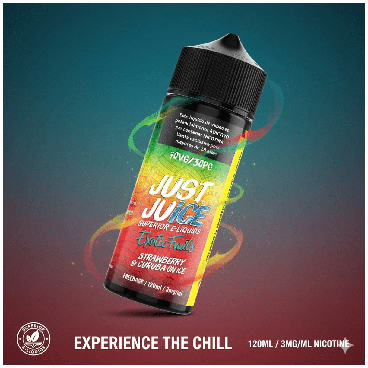 Just Juice Strawberry Curuba Super Ice 120ml, combina a la perfección la dulzura intensa de la frutilla madura y jugosa, evocando el sabor natural de la fruta recién cosechada, con el carácter exótico de la curuba tropical, una fruta sudamericana de perfil ligeramente ácido, floral y refrescante, similar al maracuyá y la guayaba.